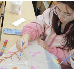 在活动现场,同学们3人为一组,利用社团准备的风筝、颜料和笔墨等工具,围绕“春分”主题DIY风筝。同学们设计中,充分发挥想象力,将动植物、水果、动漫、星空等创意绘制在风筝上,为风筝赋予了新的活力。