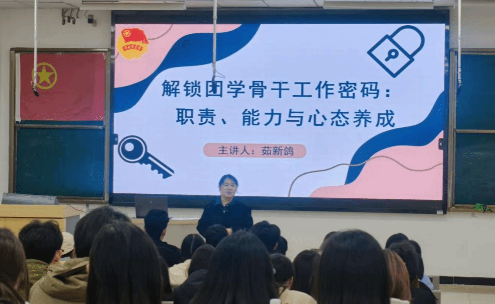 学院团委书记茹新鸽老师先后讲解《解锁团学骨干工作密码》与《团务基础知识》,前者涵盖团干部角色认知、工作态度等问题,帮助新生团学骨干找准定位;后者包括团务基础如“3214”内容,夯实工作基础,确保规范开展工作。