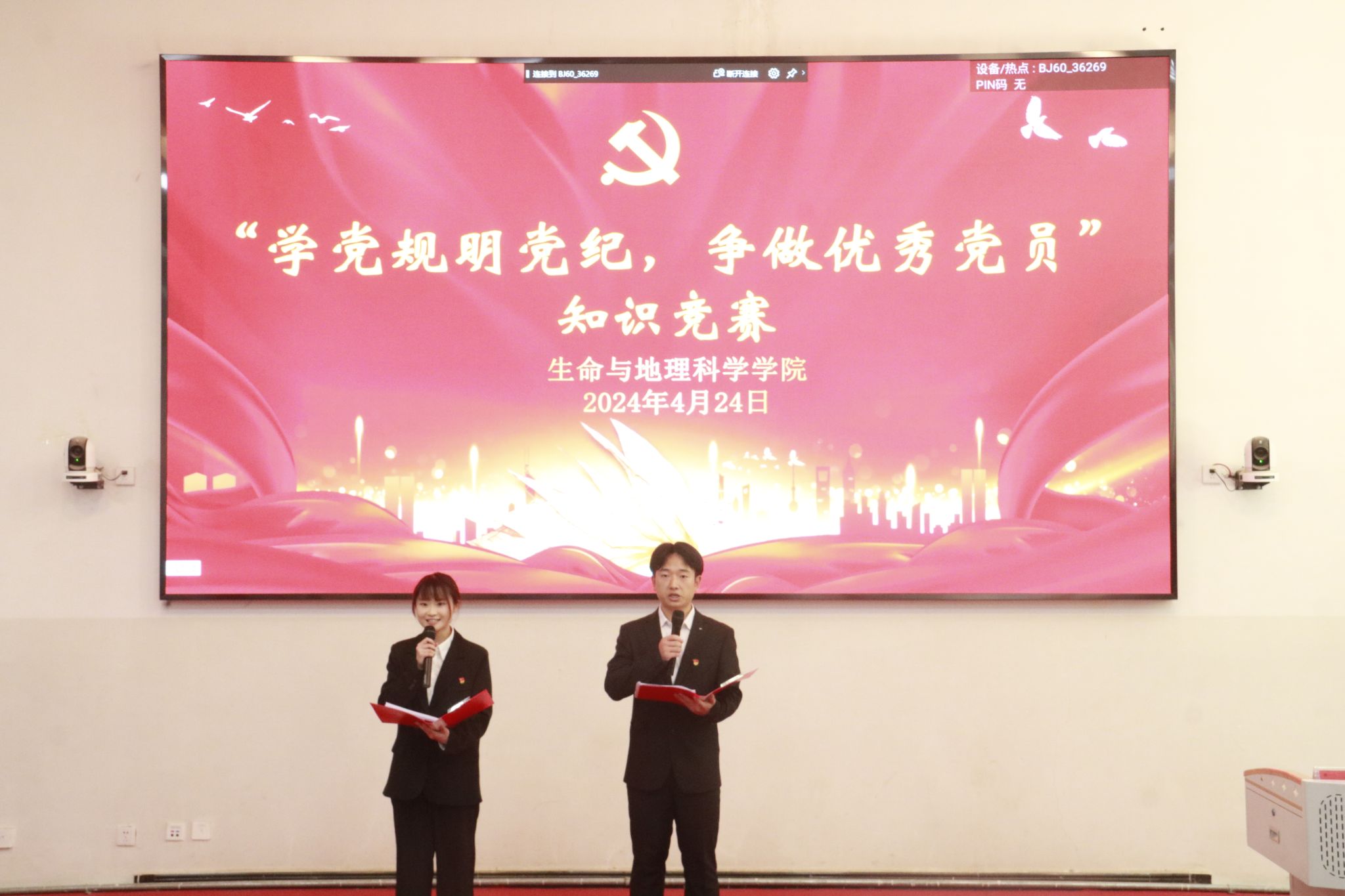 2024年4月24日下午生命与地理科学学院党委主办、教师党支部承办的“学党规明党纪,争做优秀党员”知识竞赛在学科楼A102举行,6个学生党支部18名师生党员参赛,其他师生党员和第55期入党积极分子观摩比赛。
