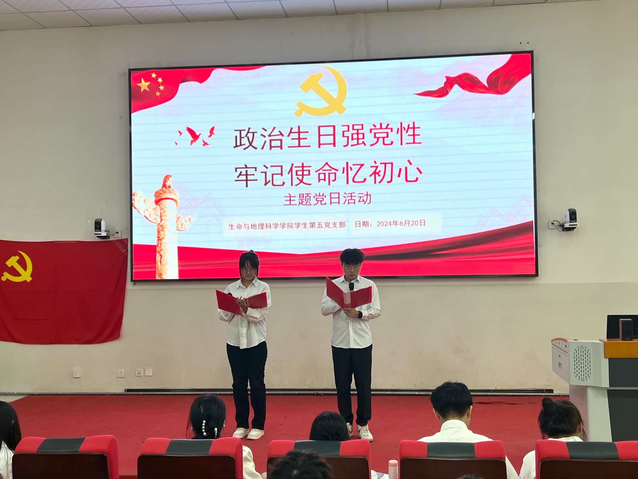 生命与地理科学学院学生第五党支部于2024年6月20日举办了一场“以政治生日强党性 牢记使命忆初心”为主题的党日活动。通过为党员过“政治生日”的形式,让党员常思常想“入党为什么、在党做什么、为党留什么”,不断强化党员自我身份认同,体现党组织对党员的关心,教育引导、激励鼓舞党员争做“四个合格”党员,增强党组织的凝聚力。本次活动共有16名党员,7名发展对象,59名入党积极分子参加。